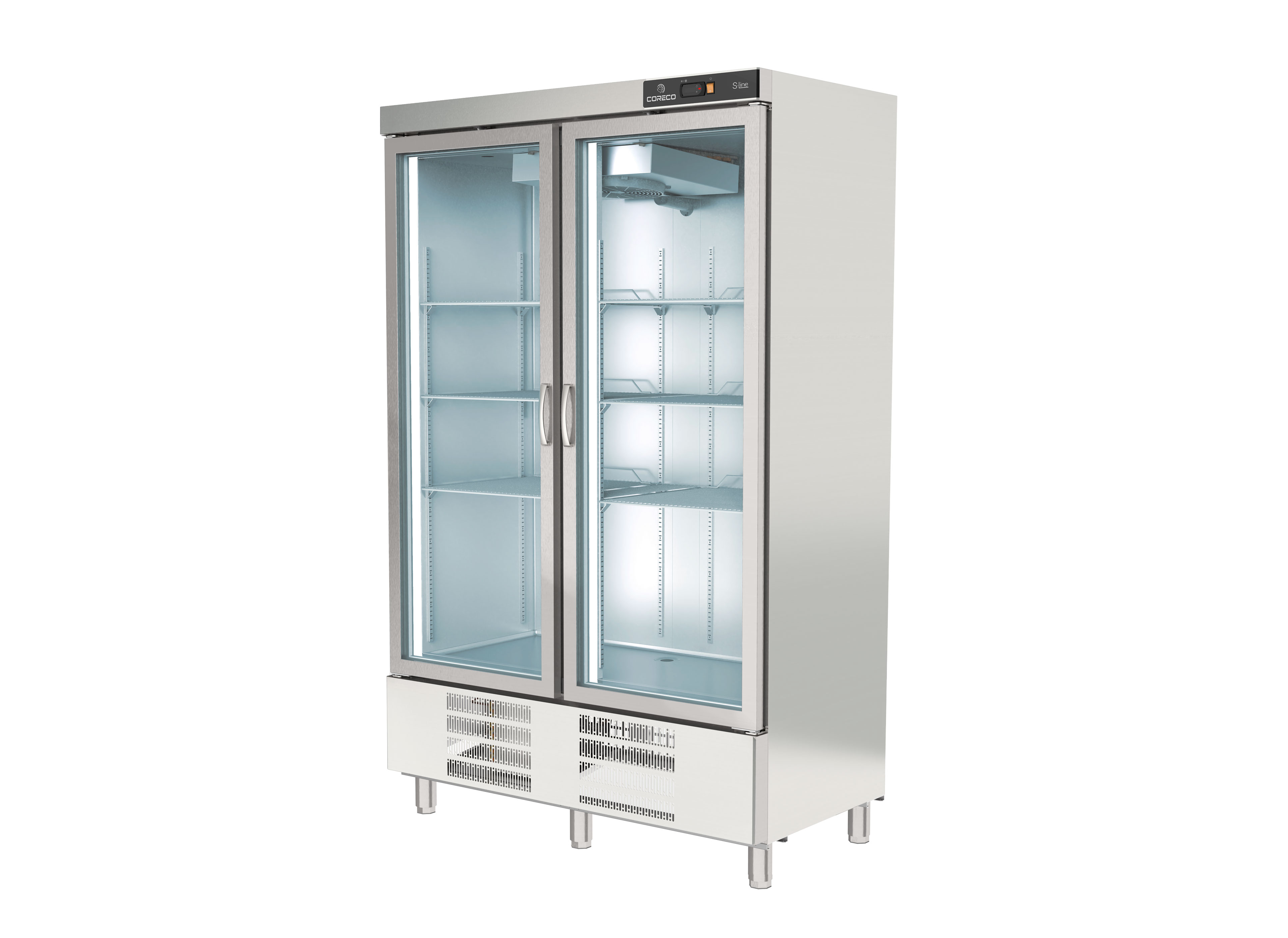 - Puertas de apertura reversible, doble cristal con sistema de cierre automático y burlete magnético (permanece abierta al superar los 90° de apertura),