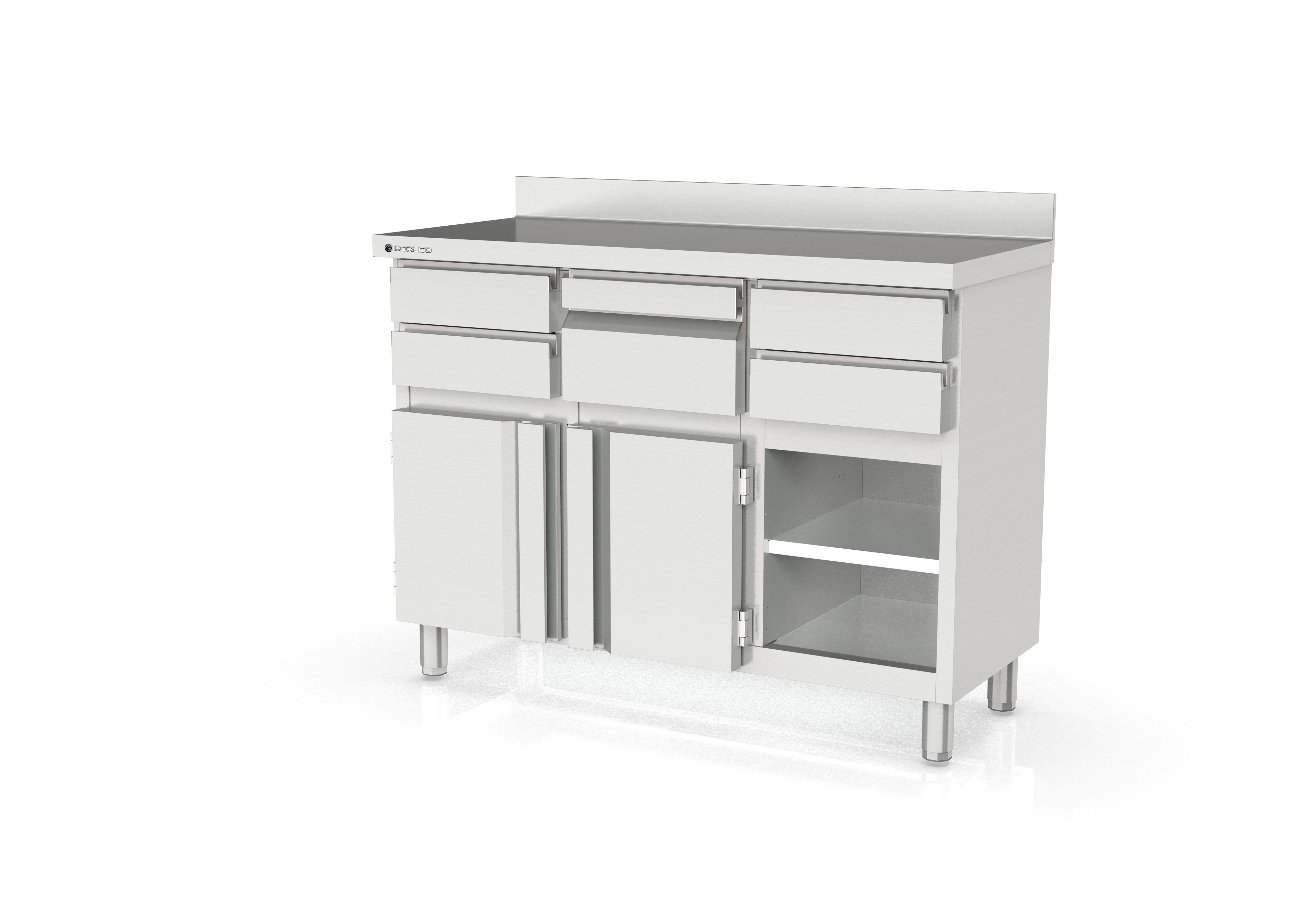 - Plan de travail en acier inox AISI-304 avec façade incurvée et dosseret sanitaire