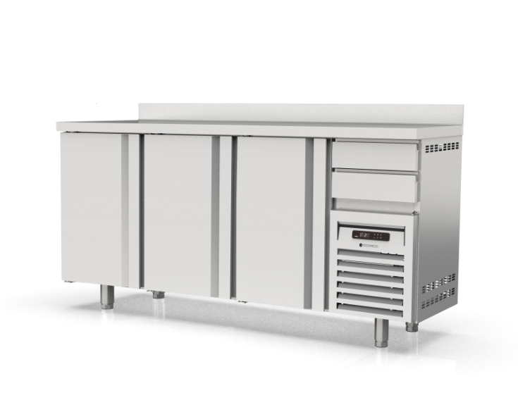- Plan de travail en acier inoxydable AISI-304 avec façade droite et dosseret sanitaire