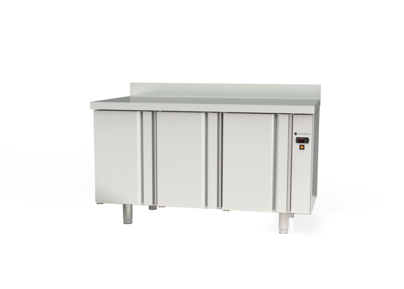- Plan de travail en acier inox AISI-304 avec façade droite et dosseret sanitaire de 100 mm (en option sans dosseret)