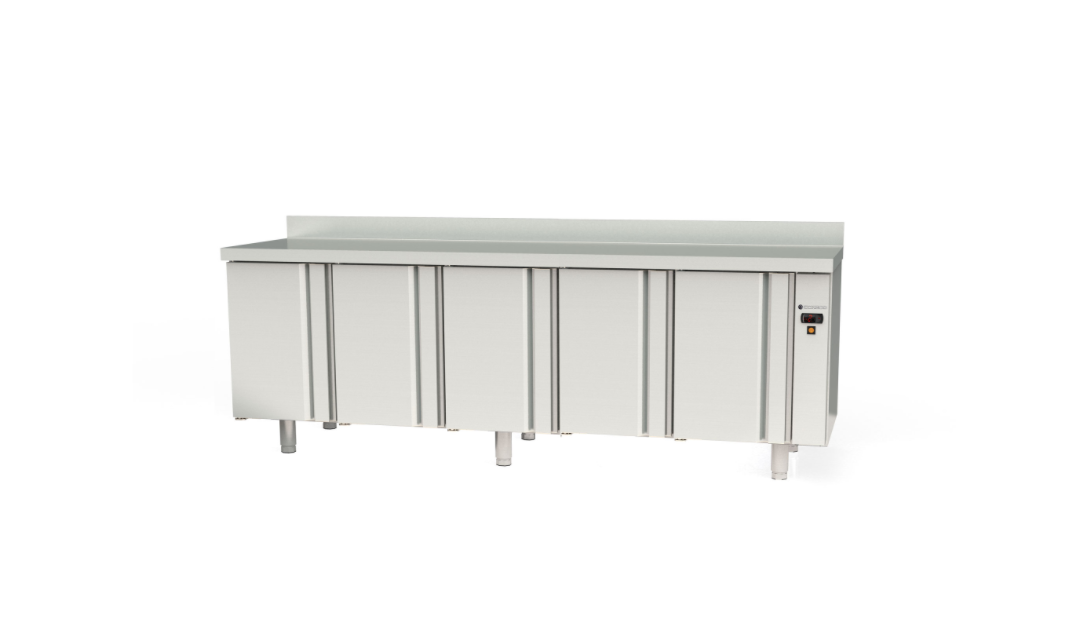 - Plan de travail en acier inox AISI-304 avec façade droite et dosseret sanitaire de 100 mm (en option sans dosseret)