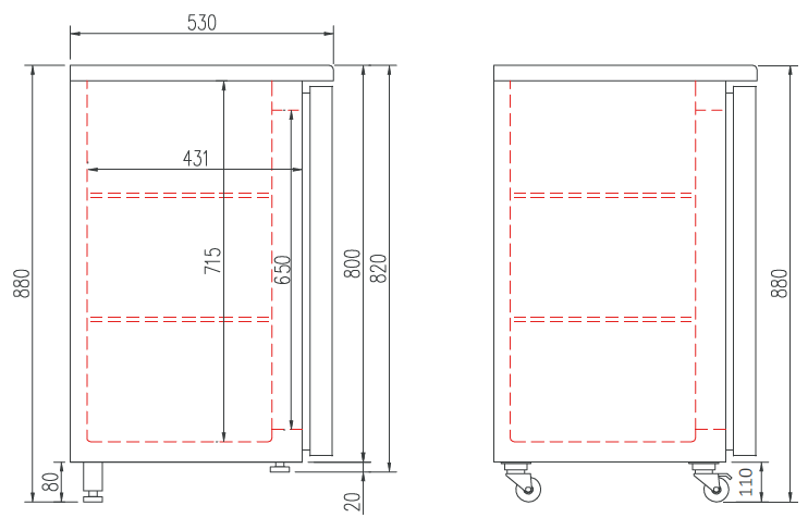 - Pieds réglables, avec supplément pour hauteur 880 mm (inclus)
