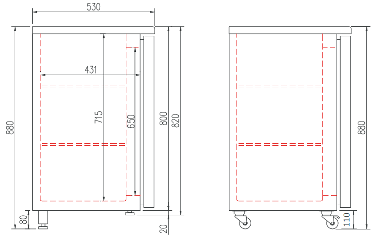 - Pieds réglables, avec supplément pour hauteur 880 mm (inclus)
