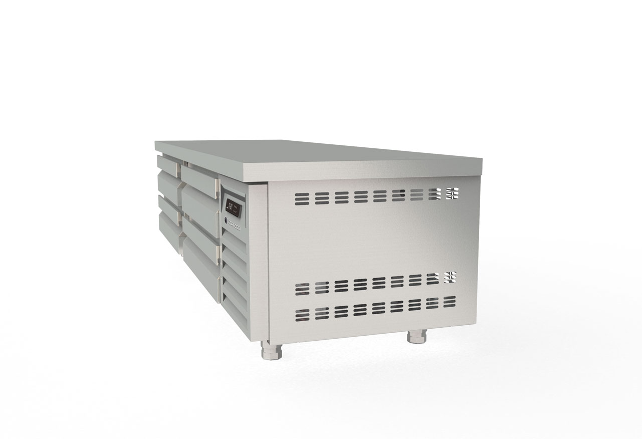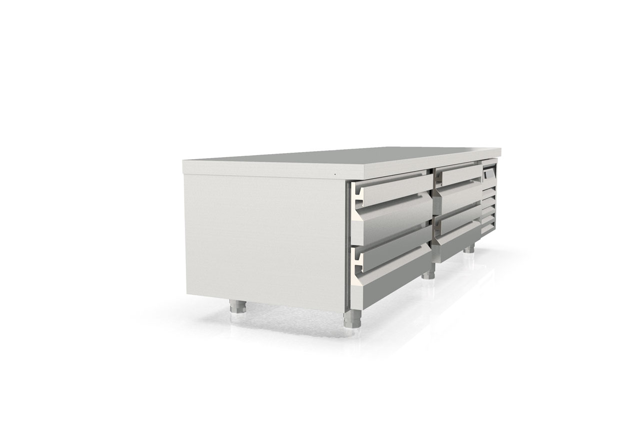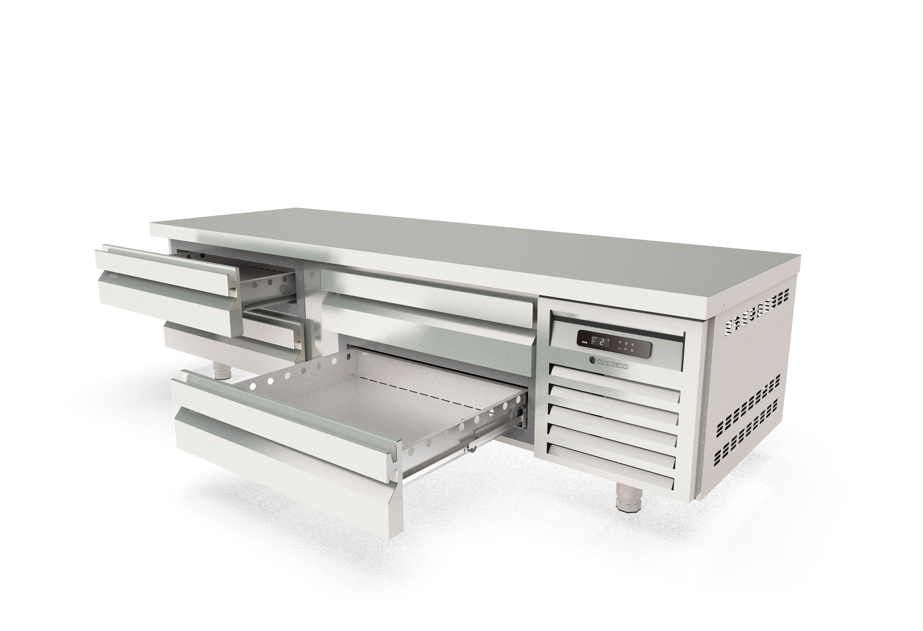 - Tiroirs réfrigérés en acier inox démontables sur glissières télescopiques en acier inox,
