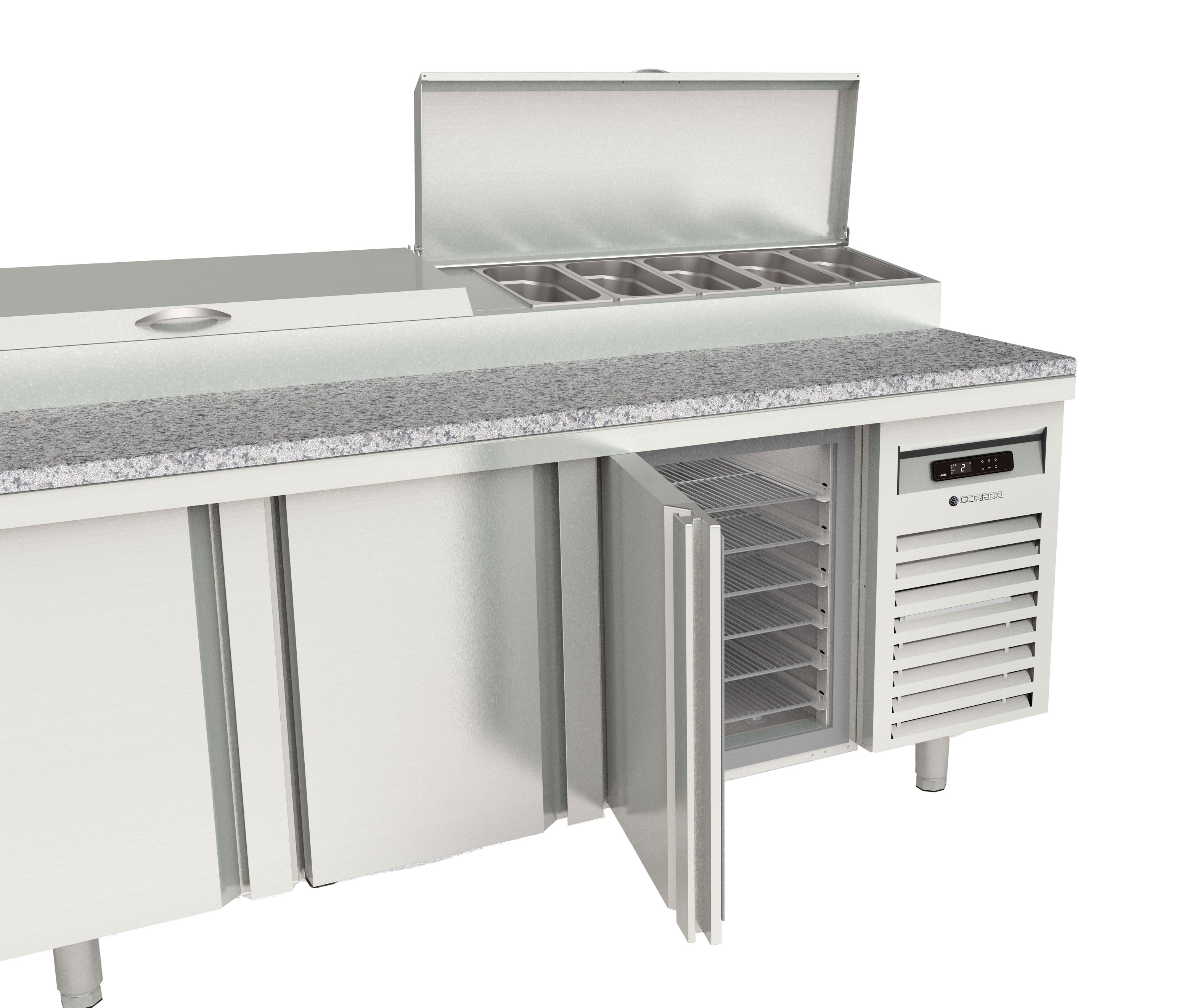 - Plan de travail en acier inoxydable avec présentoir d'ingrédients intégré et couvercle en acier inoxydable