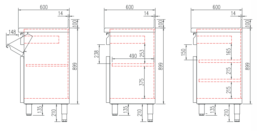 - Pieds en tube d'acier inox réglables en hauteur 135 - 210 mm