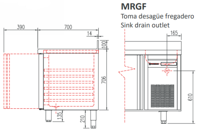 - Plan de travail en acier inoxydable AISI-304 avec façade droite et dosseret sanitaire de
