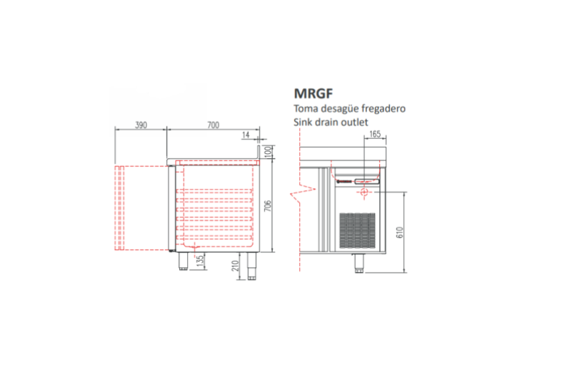 - Plan de travail en acier inoxydable AISI-304 avec façade droite et dosseret sanitaire de